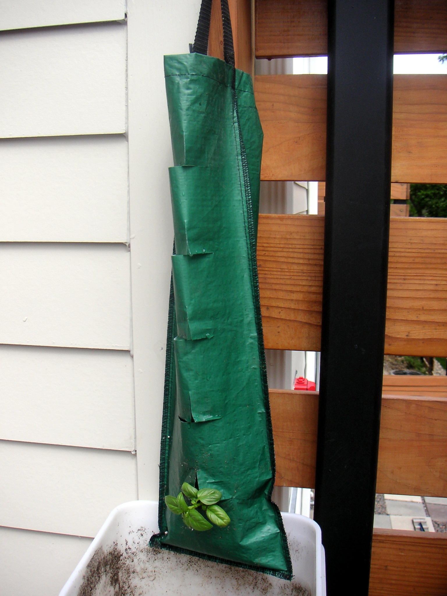 That's funny that you thought they were fabric grocery bags. :) I think there's something special about the Smart Pots. At least, they're made of a different material than grocery bags, as far as I can tell by just feeling them. The Smart Pots are supposed to be superior to other containers because they allow the roots to breathe, which encourages better root structure. We shall see. As for the sock, I think the instructions said that you could grow anything in it. There must be an ideal type of plant for it, though, but I don't know what it would be! I do think it probably would've worked better if I'd put the plant in through the top.